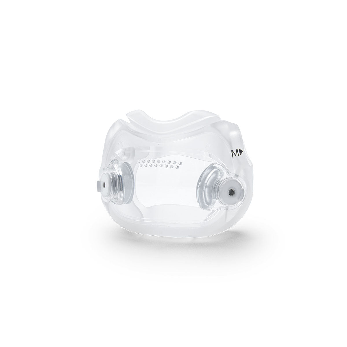 The DreamWear Full Face Mask cushion rests under the nose, providing airflow to both the mouth and nose without actually inserting into the nostrils or exerting any excess pressure. Because of the cushion's low profile design there is absolutely no contact on the top of the nose or at the sensitive nasal bridge. Exhalation ports on the cushion, and in the masks elbow, quietly disperse excess air.